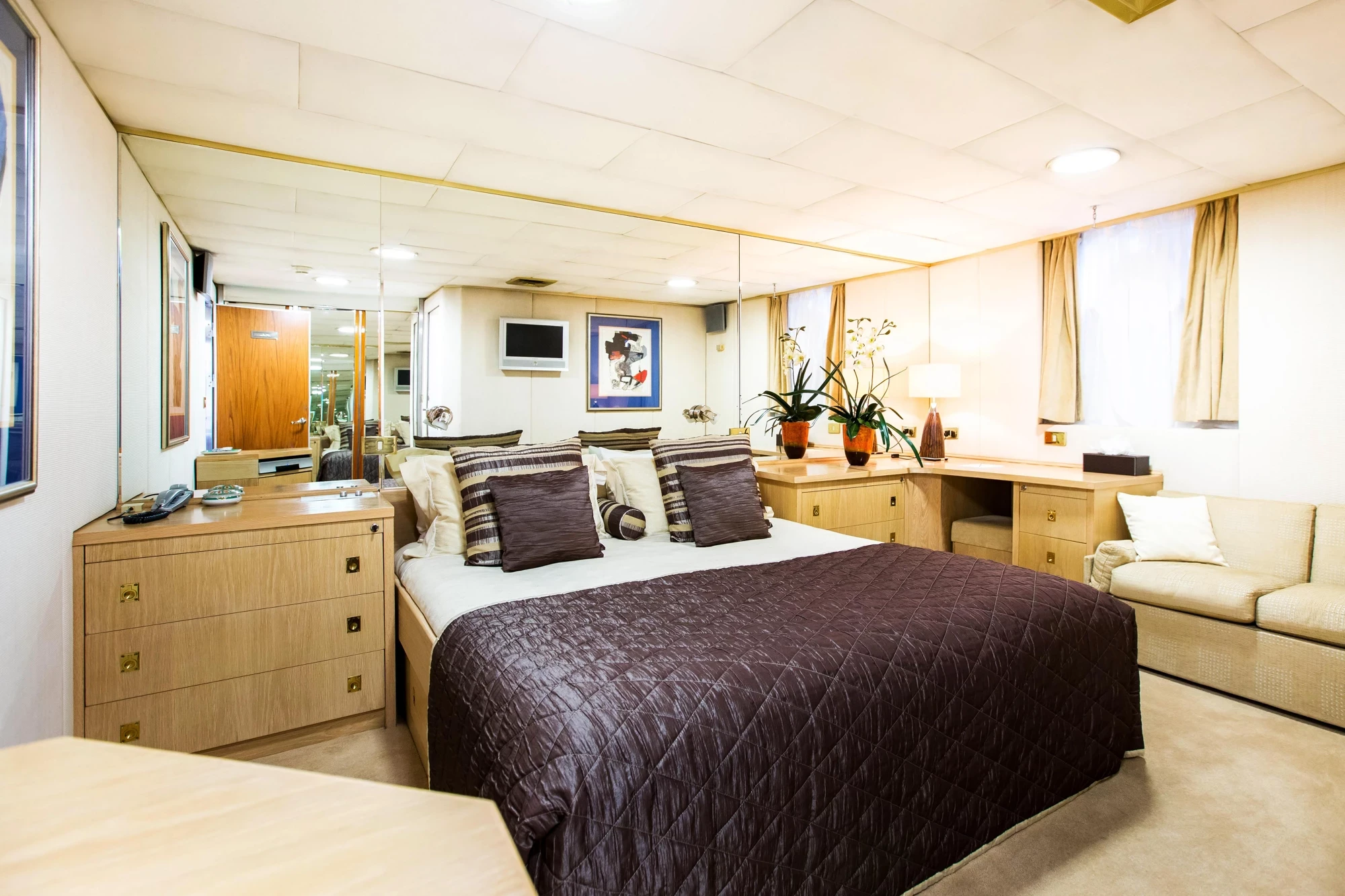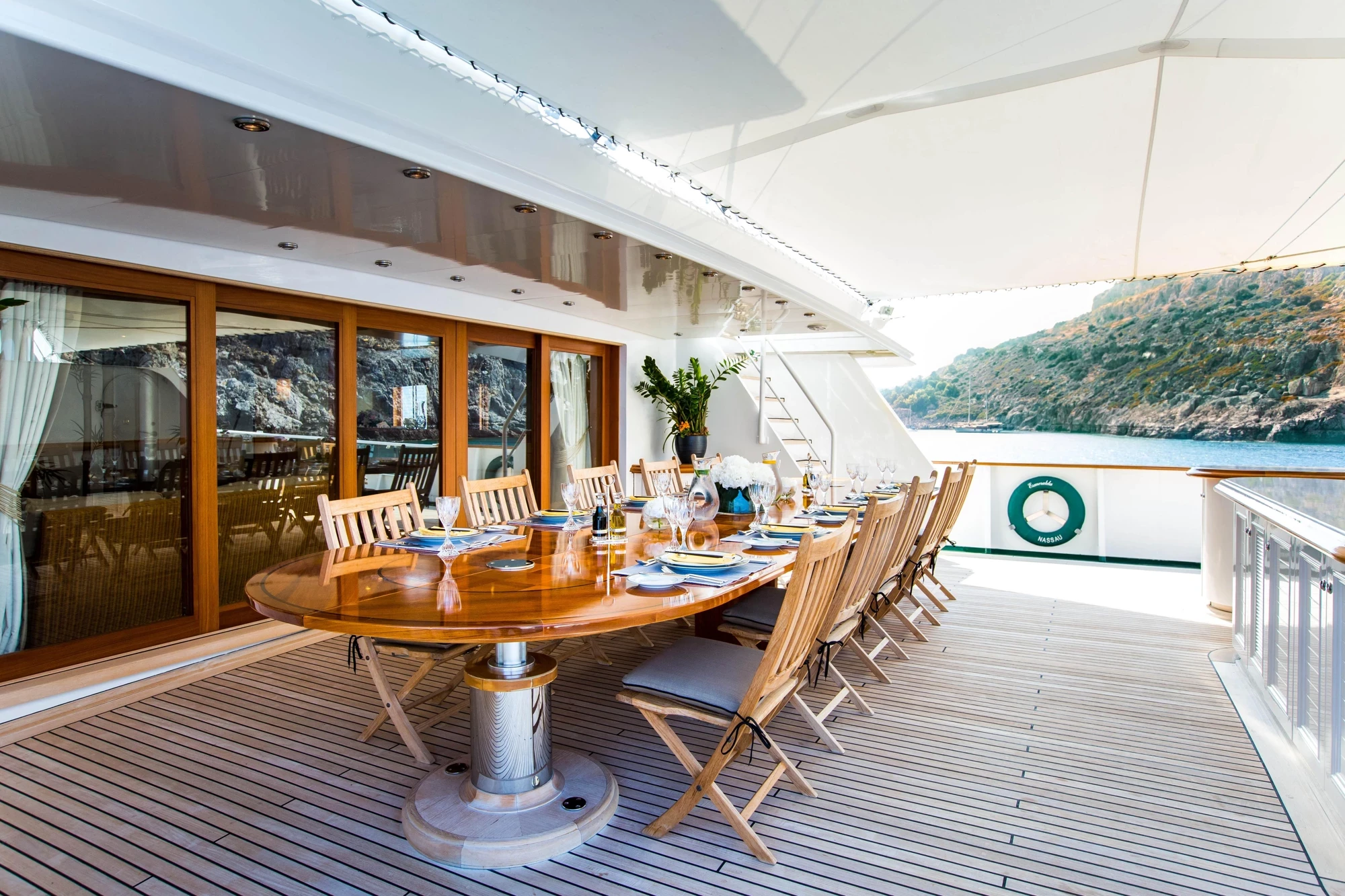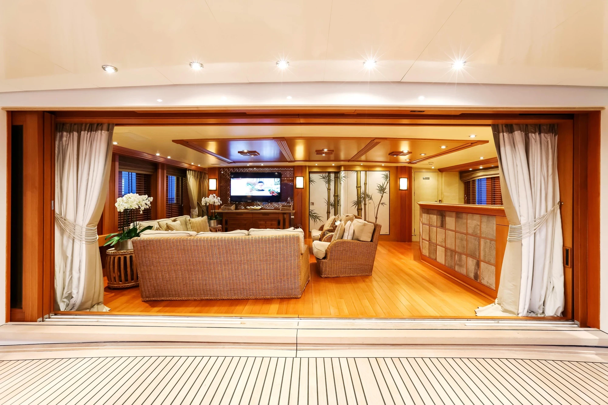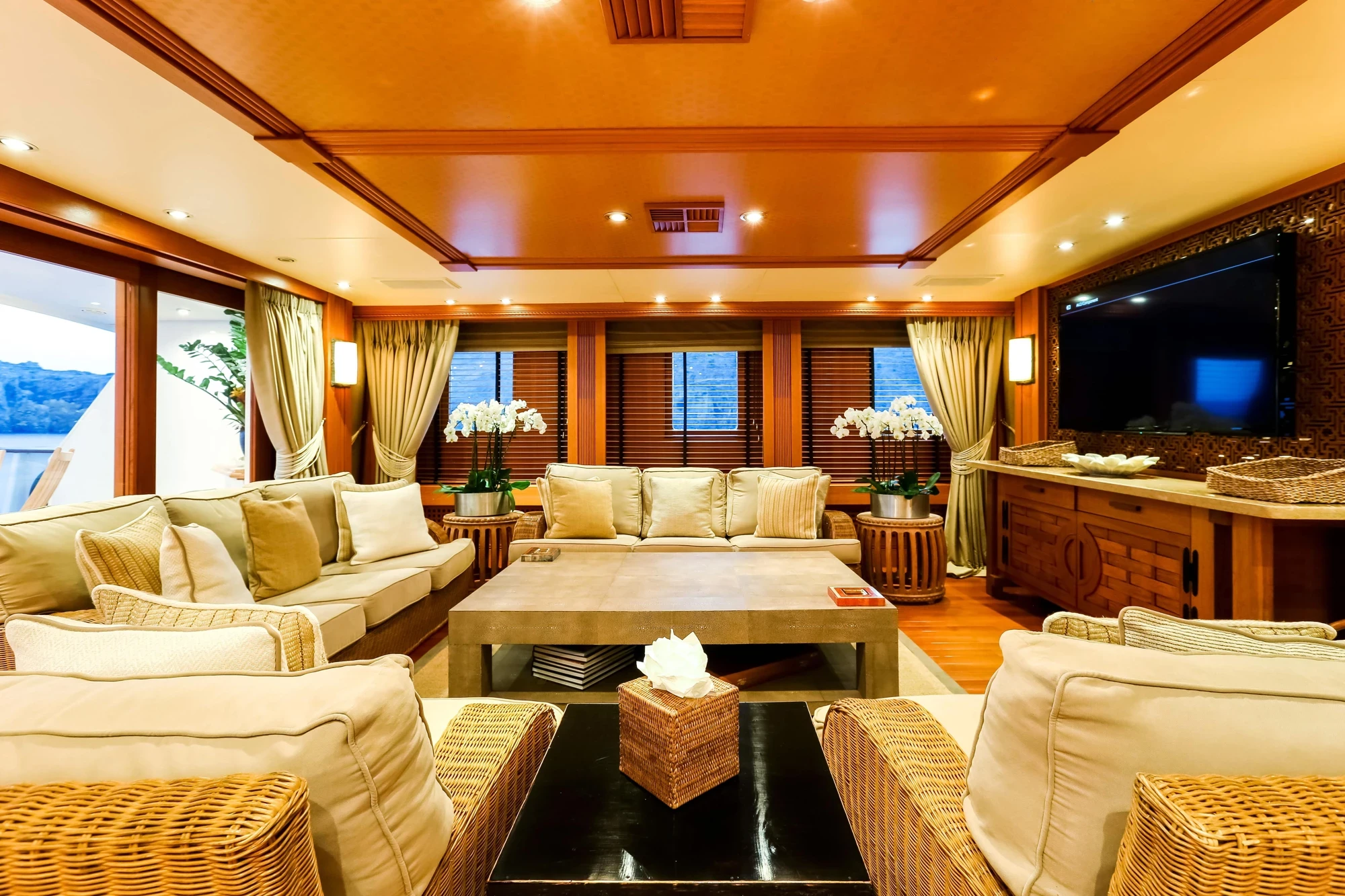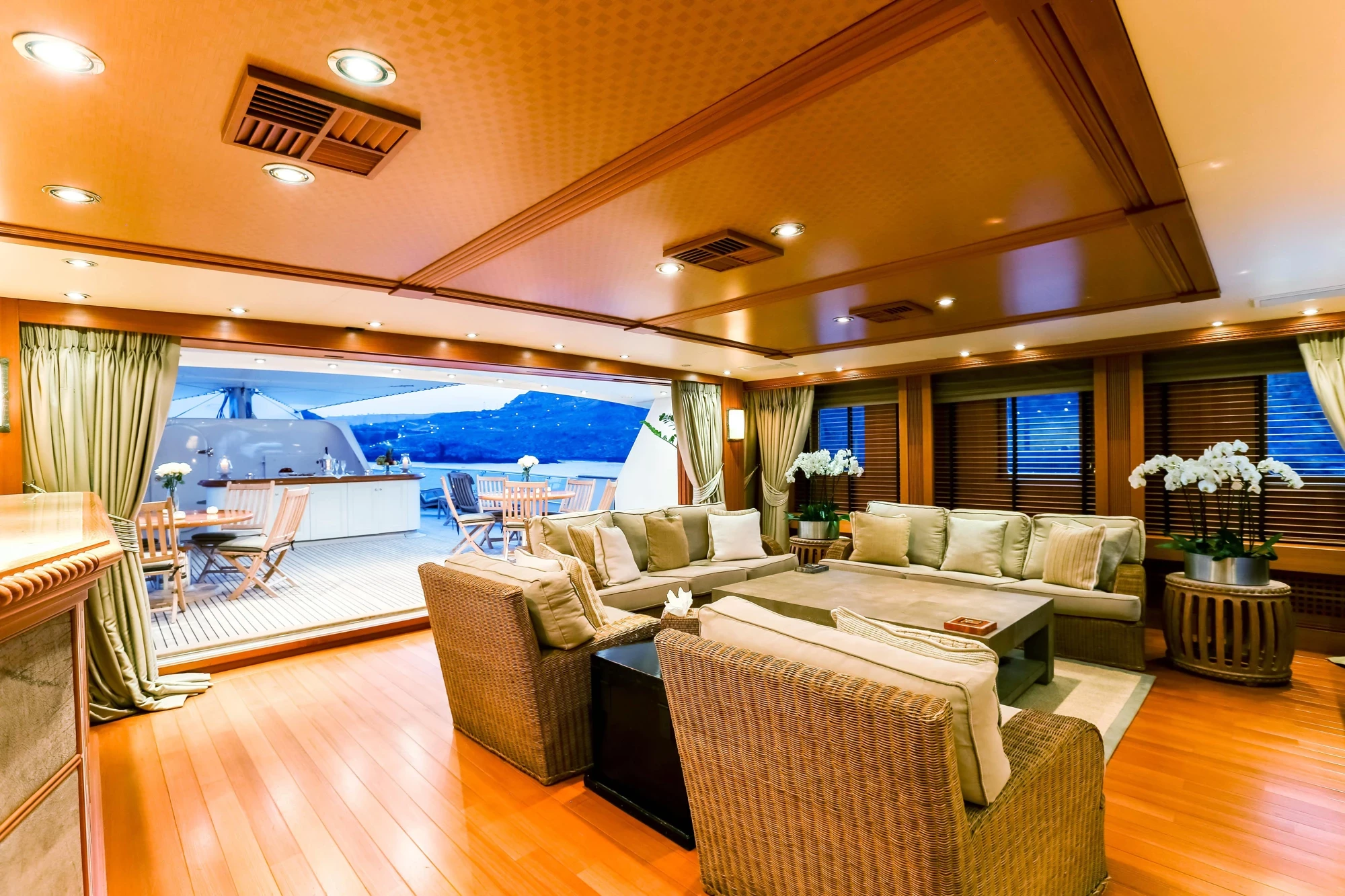 The interior of ESMERALDA is a masterful balance between classic opulence and modern comforts. With design by Studio de Jorio and updates made during a 2001 major refit, her interior blends rich wood paneling, luxurious marbles, and plush furnishings, providing a sense of warmth and relaxation. The large windows throughout her main salon allow natural light to flood the interior, creating a bright and airy space.
