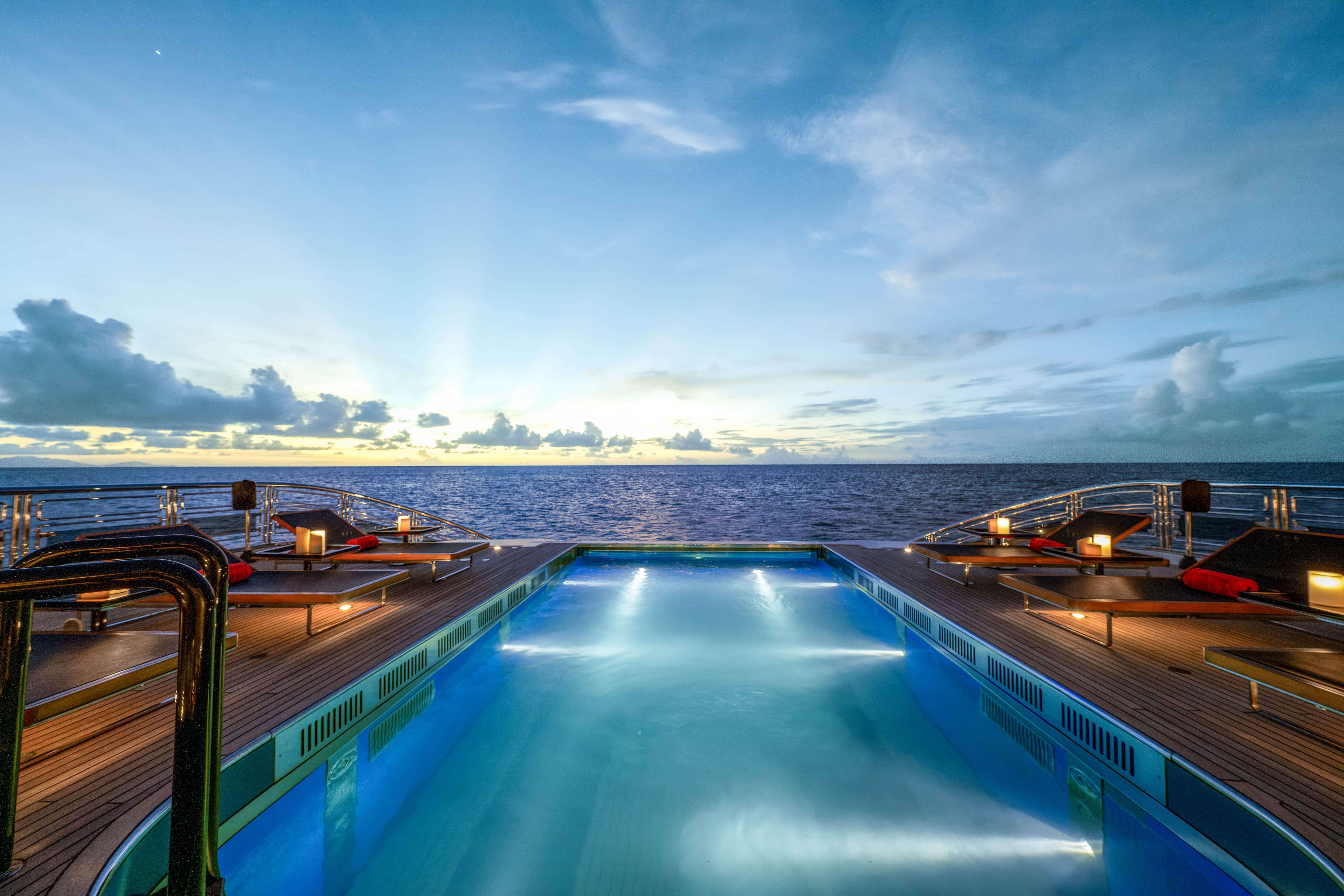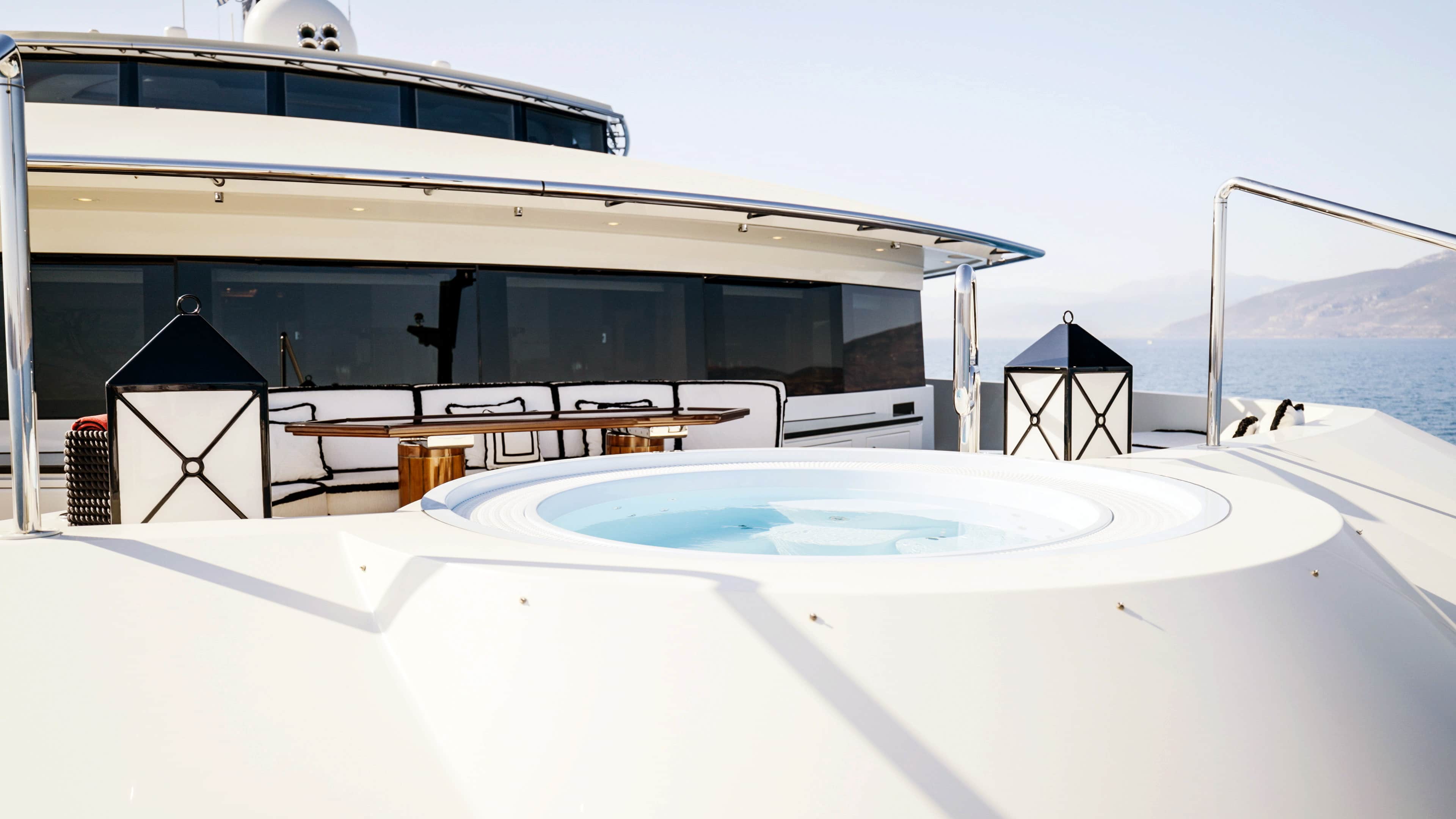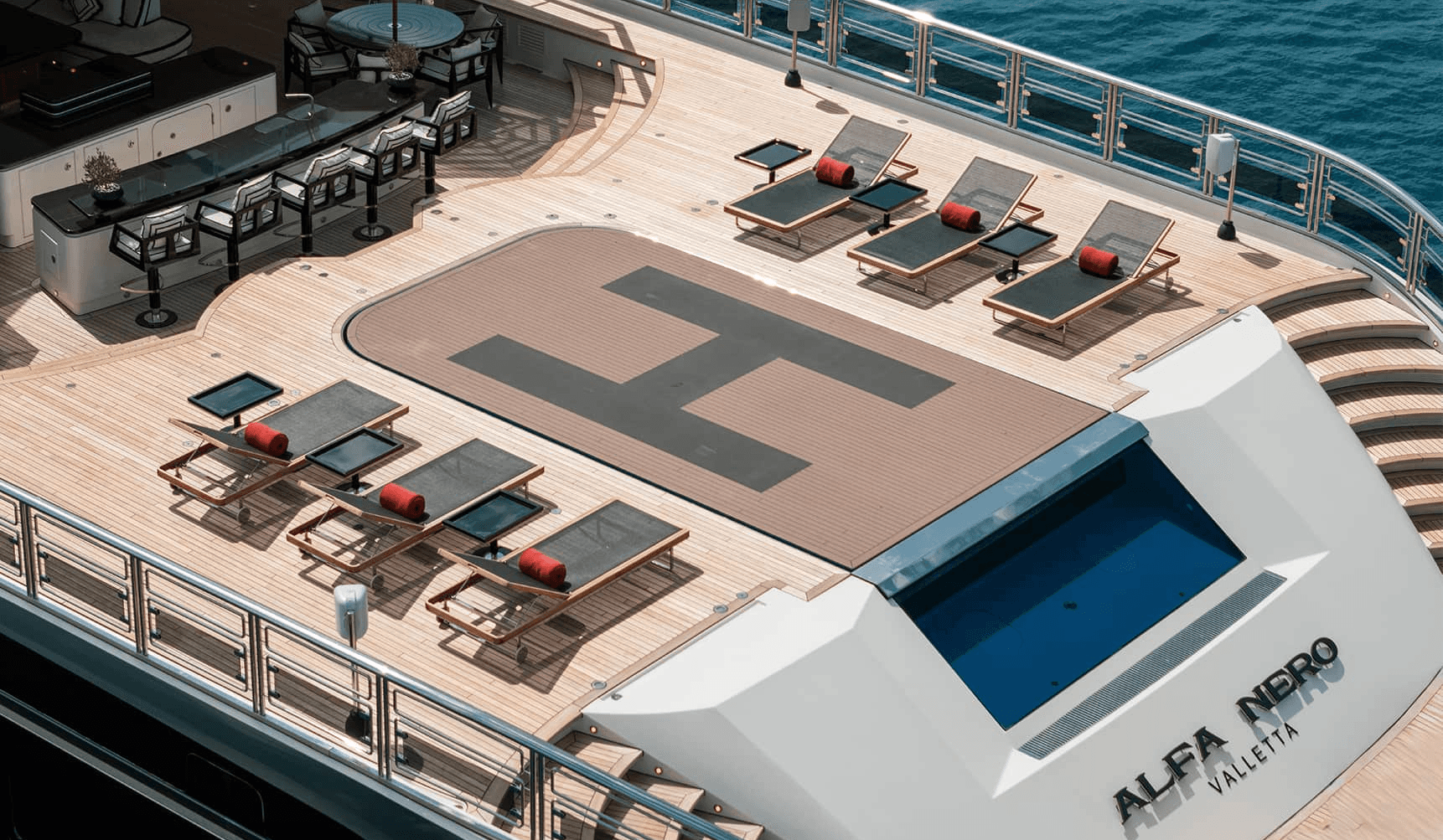 One of Alfa Nero’s most widely discussed innovations is her aft deck swimming pool, featuring a movable floor that allows the space to transform from pool to optional heli pad. This concept, first realised on Alfa Nero, has since been echoed across numerous high-profile superyachts — a testament to her influence rather than imitation.