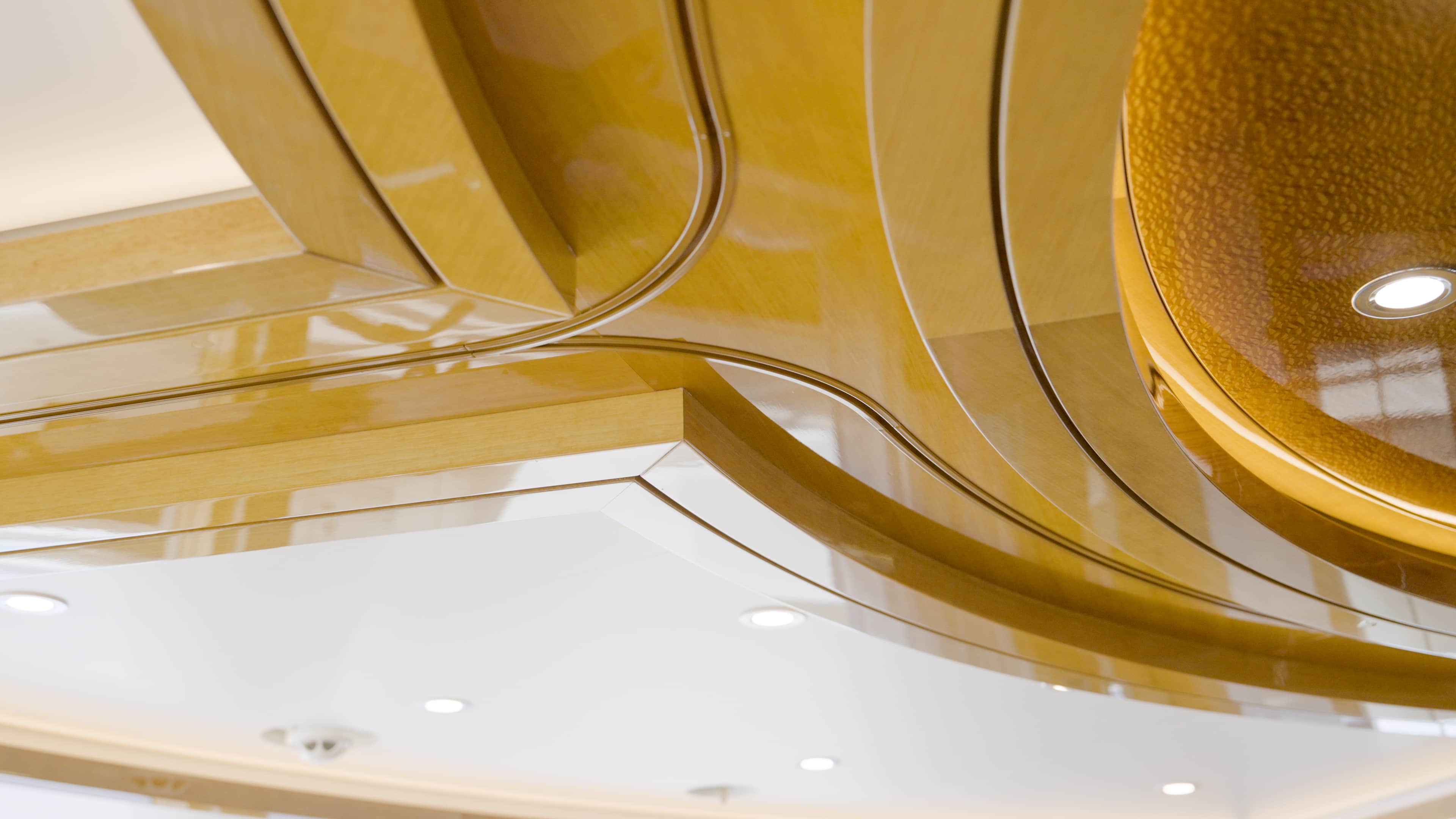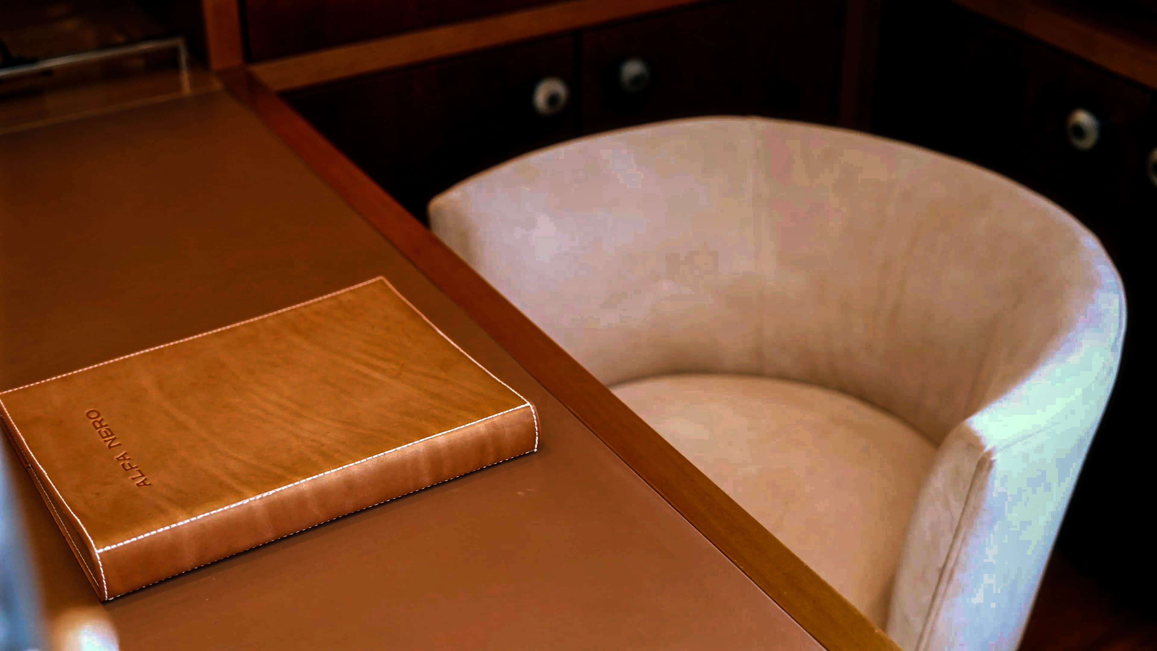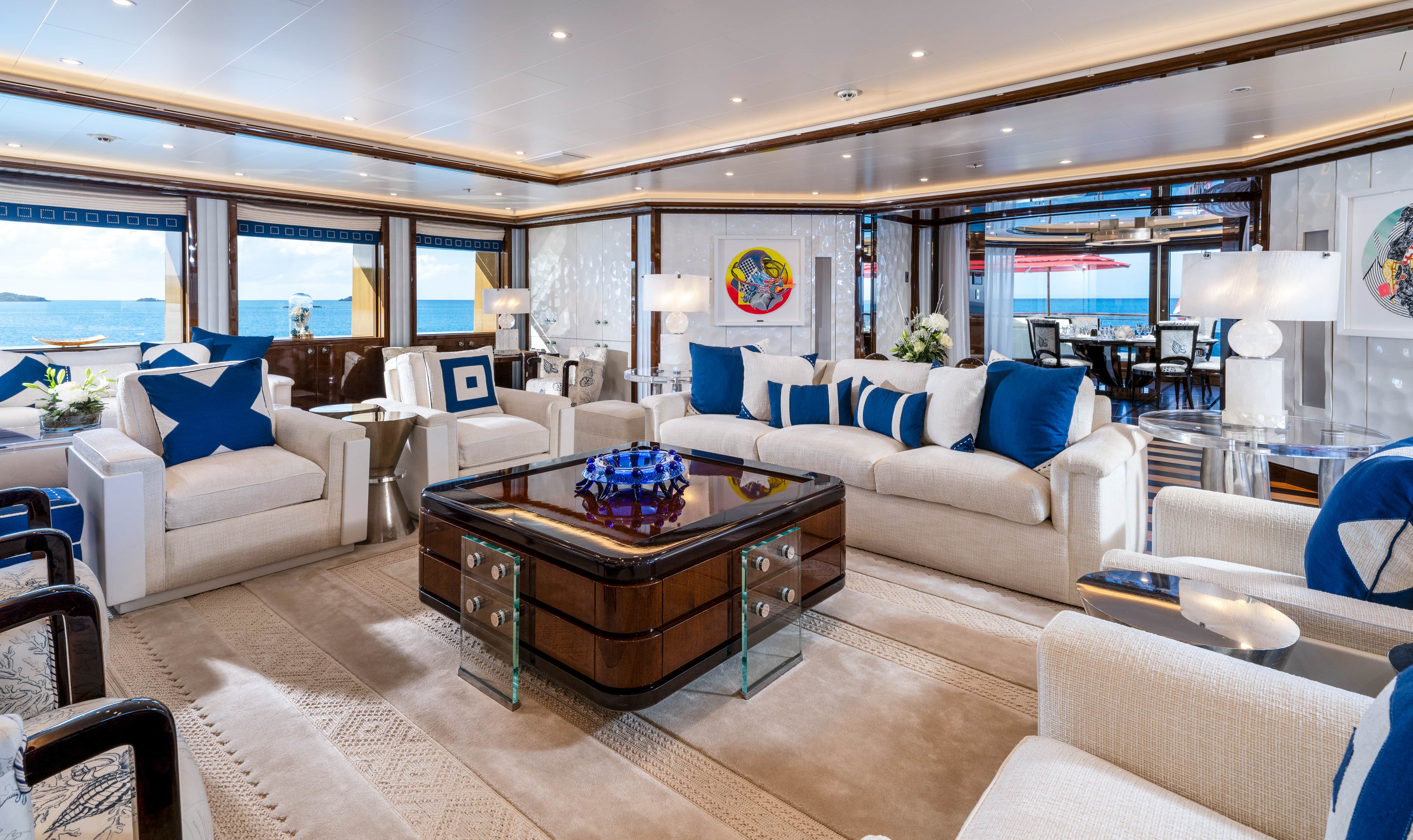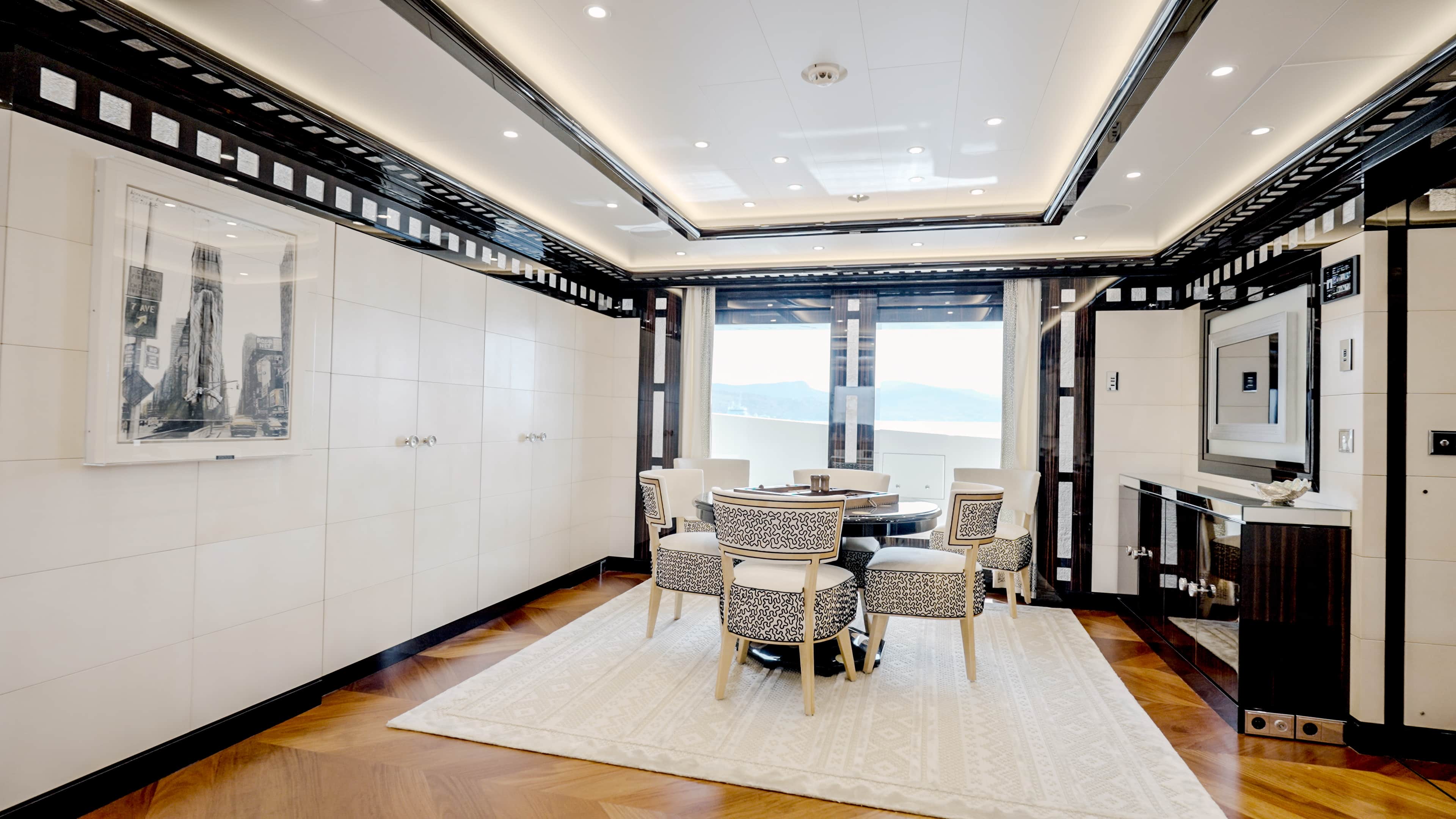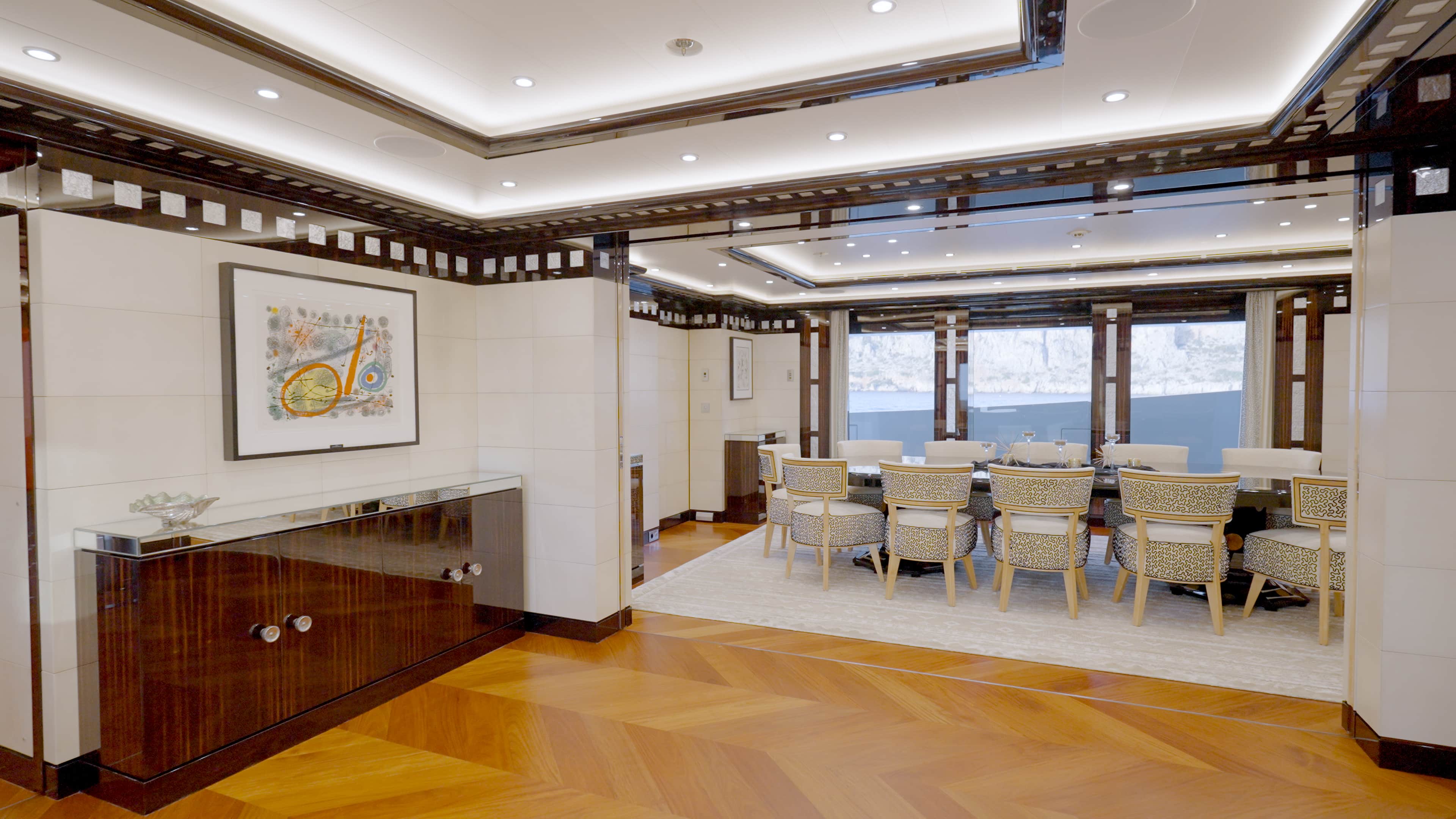 The interior design by Alberto Pinto reflects a confident, residential approach to luxury. Rather than following transient trends, Pinto created interiors that feel composed, architectural, and richly layered. High-gloss woods, stone finishes, bespoke furniture, and curated artworks define the atmosphere throughout the yacht.