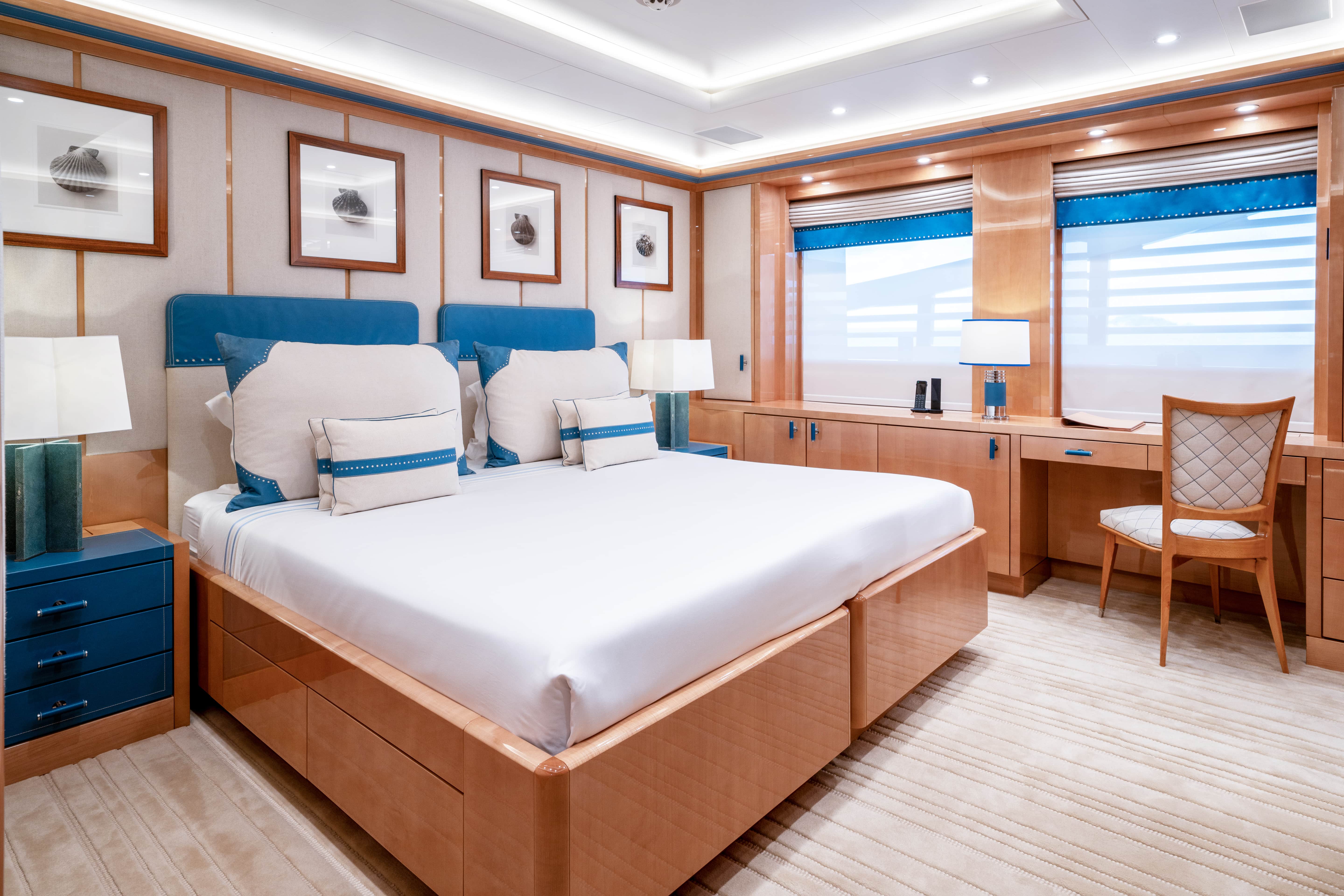 The Owner’s suite, located on the upper deck forward, spans the full beam and benefits from panoramic forward views, private office space, dressing rooms, and direct access to a secluded exterior deck with a private jacuzzi.