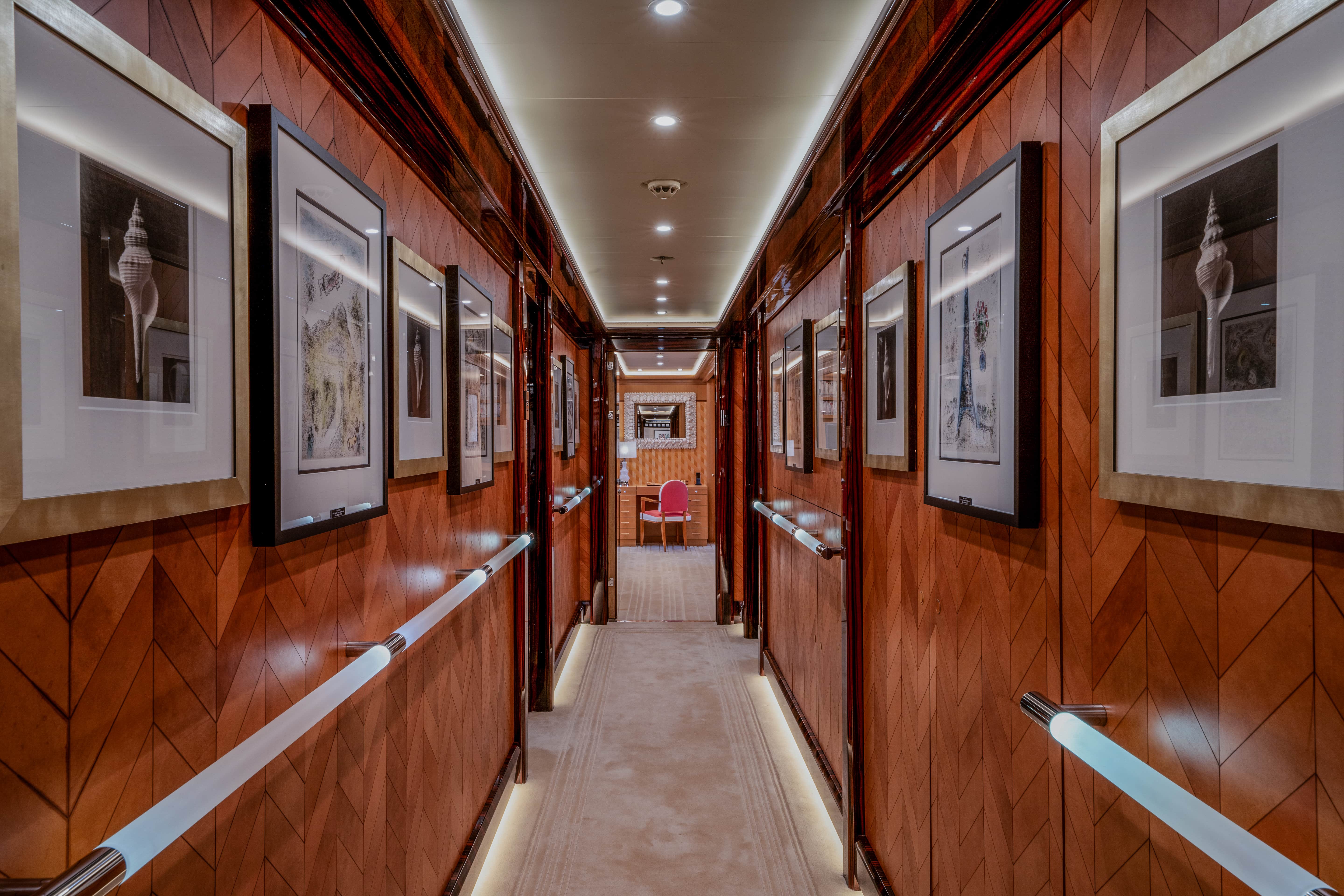 A discreet guest elevator serves multiple decks, enhancing accessibility and comfort throughout the yacht.