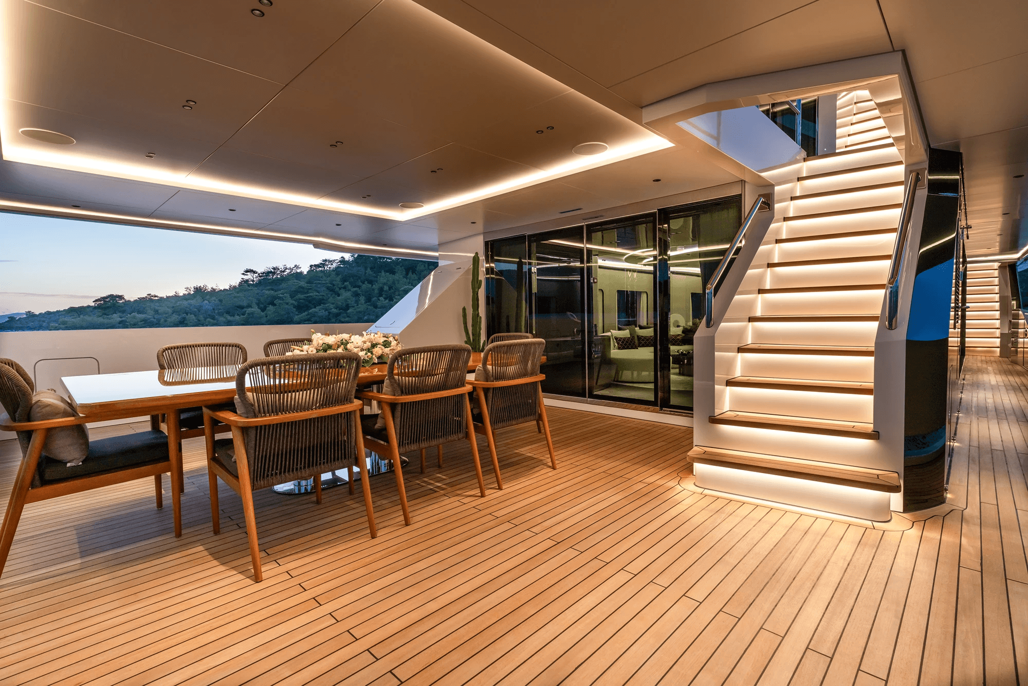 The upper deck skylounge introduces a more architectural tone, moody and elegant, opening to a shaded aft terrace with glass balustrades.